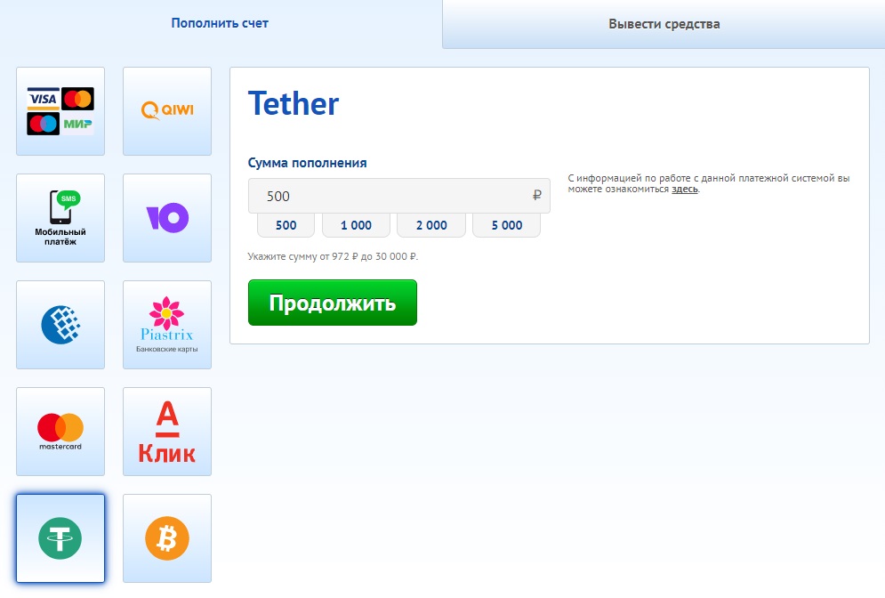Пополнения счета через Tether