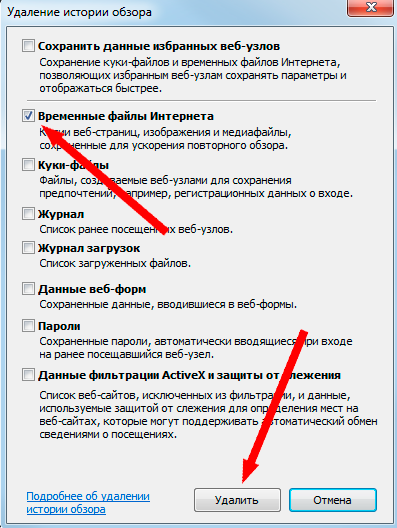 Появится окно «Удаление истории обзора», где напротив пункта «Временные файлы интернета» поставьте галочку и нажмите «Удалить».