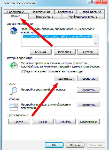 В открывшемся окне выберите вкладку «Общие». В рубрике «История просмотра» нажмите «Удалить».