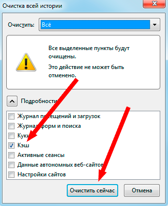 Для того, чтобы быстро удалить кэш нажмите сочетание клавиш Ctrl+Shift+Delete и в появившемся окне браузера Mozilla Firefox «Стирание недавней истории» выберите вкладку «Удалить» — «Все». Поставьте галочку напротив «Кэш» и нажмите кнопку «Очистить сейчас».