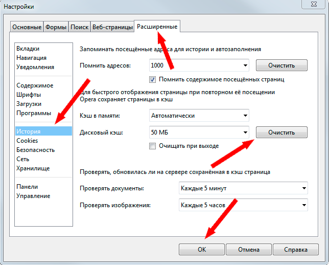 Для очистки кэша нажмите сочетание клавиш Ctrl+F12, в появившемся окне выберите вкладку «Настройки», затем слева — раздел «История». Напротив пункта «Дисковый кэш» нажмите кнопку «Очистить», после чего закройте окно.